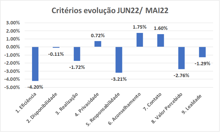 Privacidade, Aconselhamento e Contato foram os critérios com evolução positiva no mês de junho, enquanto os demais apresentaram evolução negativa, sendo Eficiência o critério com pior evolução.