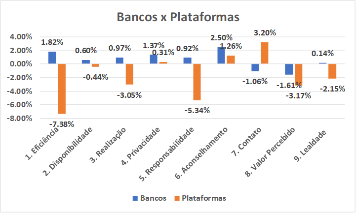 Ao separar bancos e plataformas, os bancos apresentaram evolução positiva em todos os critérios, menos Contato e Valor Percebido, destaque para Aconselhamento com evolução de 2,50%. As plataformas apresentaram evolução negativa em seis dos nove critérios, com destaque para Eficiência (-7,38%), Responsabilidade (-5,34%) e Valor Percebido (-3,17%).