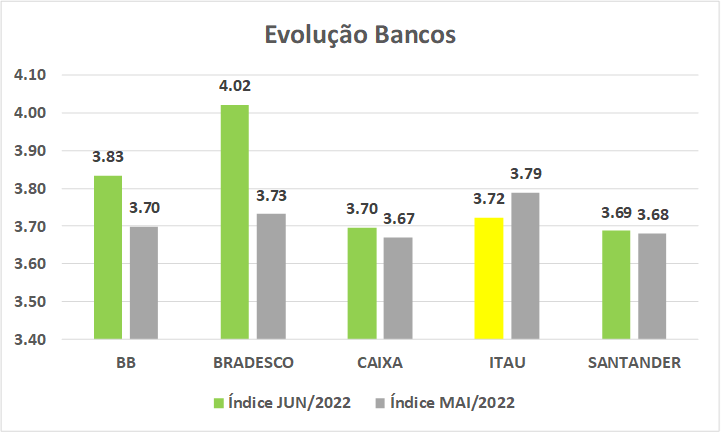 Com um volume maior que 10 respondentes, o Bradesco foi o banco mais bem avaliado pelos clientes em junho de 2022, seguido pelo BB e Itaú. O Bradesco também se destacou do lado positivo, com 7,76% de evolução em relação a abril. Já o Itaú foi o que pior evoluiu, com queda de 1,76% na sua avaliação. O gráfico mostra quem subiu (verde) e quem desceu (amarelo) na comparação com maio (cinza):