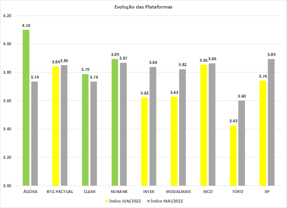 Nas plataformas, a Ágora foi a mais bem avaliada, seguida pelo Nubank e Rico. A Toro foi a mais mal avaliada. O gráfico mostra quem subiu (verde) e quem desceu (amarelo) na comparação com maio (cinza):