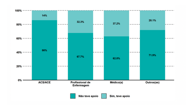 Além disso, a maior parte dos entrevistados (81,6%) relatou ter percebido impacto na sua saúde mental, taxa que se apresentou de maneira regular entre as diversas profissões analisadas. Apenas uma parcela pequena desses trabalhadores recebeu algum tipo de apoio para o autocuidado. A categoria que menos recebeu esse apoio foi a dos agentes comunitários de saúde (ACS), com 14%.